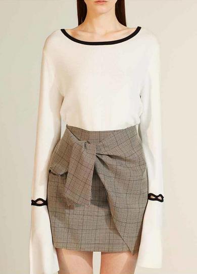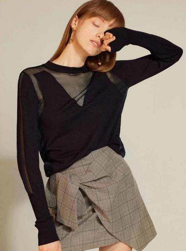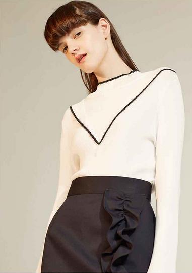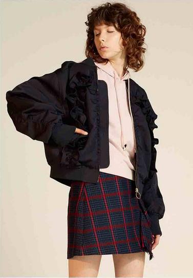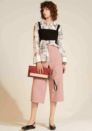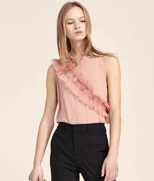 套頭衫荷葉邊給純色背心增色不少,沒有一般世俗的矯揉造作,與率性褲裝搭配,反而有不一樣的帥氣及雷厲風(fēng)行的感覺
