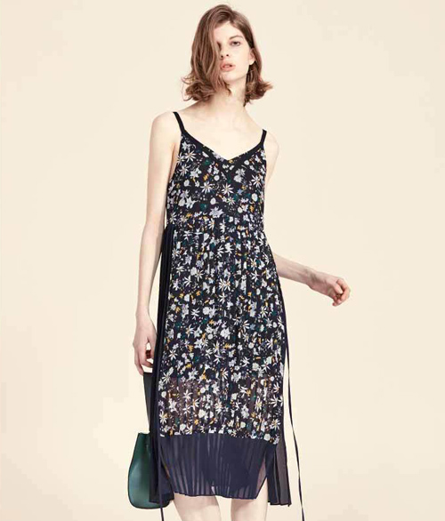 連衣裙時(shí)尚大面積印花圖案,讓整條連衣裙顯得淑女優(yōu)雅。下半身百褶的拼接與流蘇飄帶的設(shè)計(jì),展現(xiàn)迷人少女風(fēng)情
